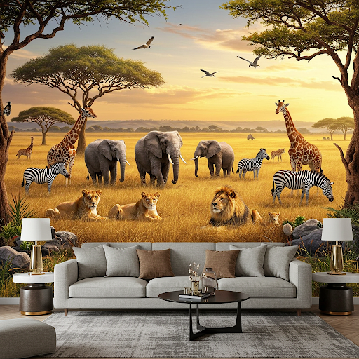 Elephant wallpaper can add a touch of nature and elegance to any living room. The textured, lifelike appearance of the elephants can create a sense of depth and dimension, making the space feel more spacious and inviting. A focal wall behind a sofa or entertainment center can create a dramatic and inviting atmosphere.