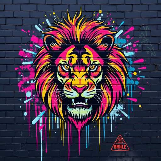 The aesthetic is defined by Dynamic Chaos and Tactile Layers. These murals often feature a lion’s head rendered through aggressive brushstrokes, “paint drips,” and stenciled outlines. The “3D” effect in this style is achieved through visual texture. Mimicking the look of a weathered brick wall or layered wheatpaste posters. Elements like “splatter” effects and jagged, hand-drawn typography (often spelling out words like “KING” or “PRIDE”) add a sense of movement. It often incorporates a “mixed media” feel, where the lion appears to be “tagging” its own presence onto the dark background.