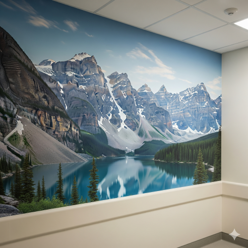 Murals featuring calming, representational nature scenes (biophilic design) are scientifically proven to reduce patient stress, lower blood pressure, and ease anxiety associated with medical visits.