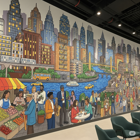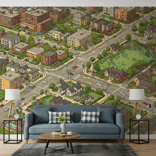 Real estate office wallpaper refers to specialised large-scale wall coverings designed for property offices and showrooms. These murals integrate geographic maps, local cityscapes, or architectural renders to visually demonstrate market expertise.