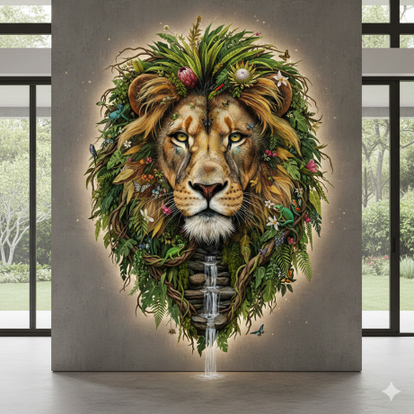 The palette shifts dramatically to “Lush Jungle Greens,” featuring deep emeralds, teals, and neon-bright exotic flora. These cool tones balance the warmth of the room and create a refreshing, adventurous mood. The inclusion of cascading waterfalls and tropical ferns adds a layer of “Visual Depth” that makes the wall feel like a gateway into a living forest.